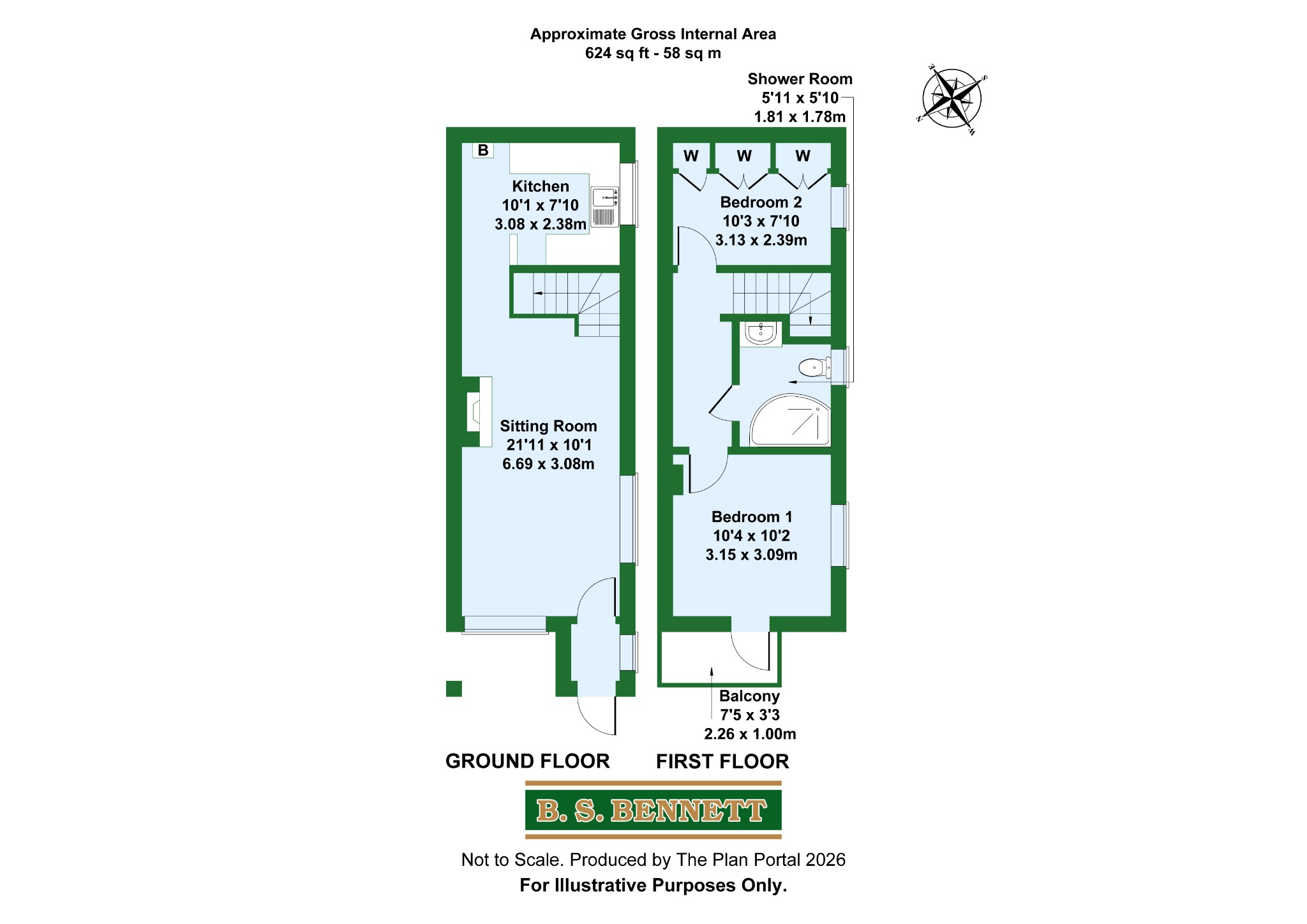 entrance porch | sitting room | fitted kitchen | landing | two bedrooms | main bedroom with balcony | bathroom | garden | own gated parking area