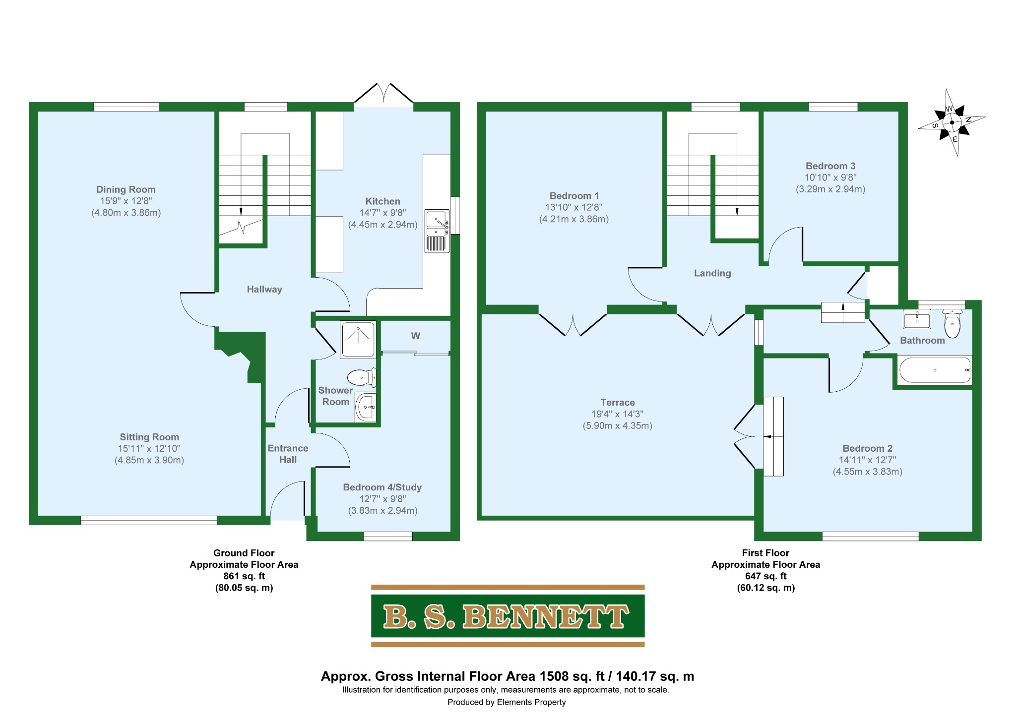 The large well-maintained grounds are situated at the front of the property and measure approximately 29 m (95 ft) being the maximum width and 36 m (120 ft) being the maximum length. Mainly laid to lawn with mature shrubs and trees. There is a large timber outbuilding 4.86 m (15 ft 9") x 4.17 m (13 ft 6") with a solid concrete floor, power, and light. And a separate summerhouse 3.56 m (11 ft 6") x 3.67 m (12 ft 0") which also has power and light. At the front of the property there is parking for at least three cars.